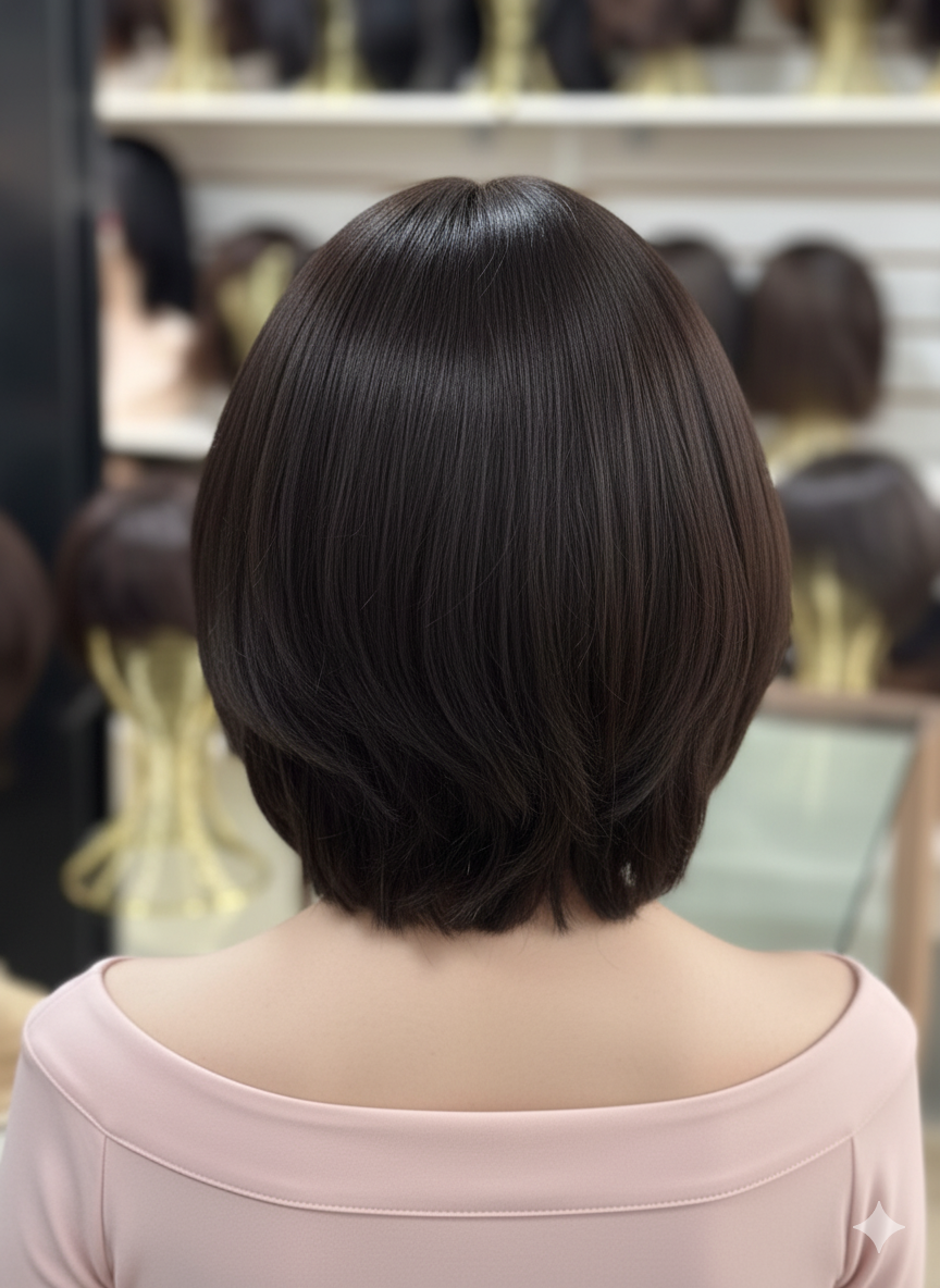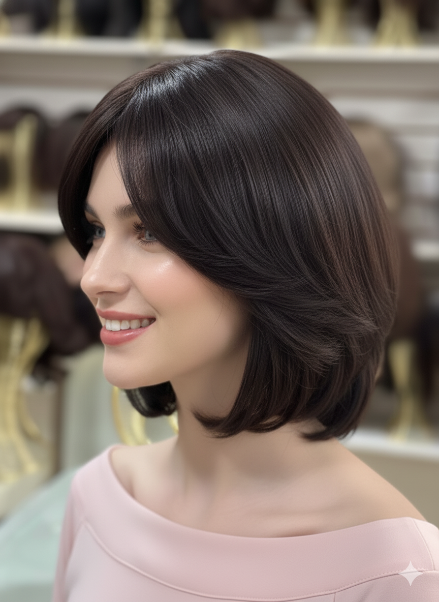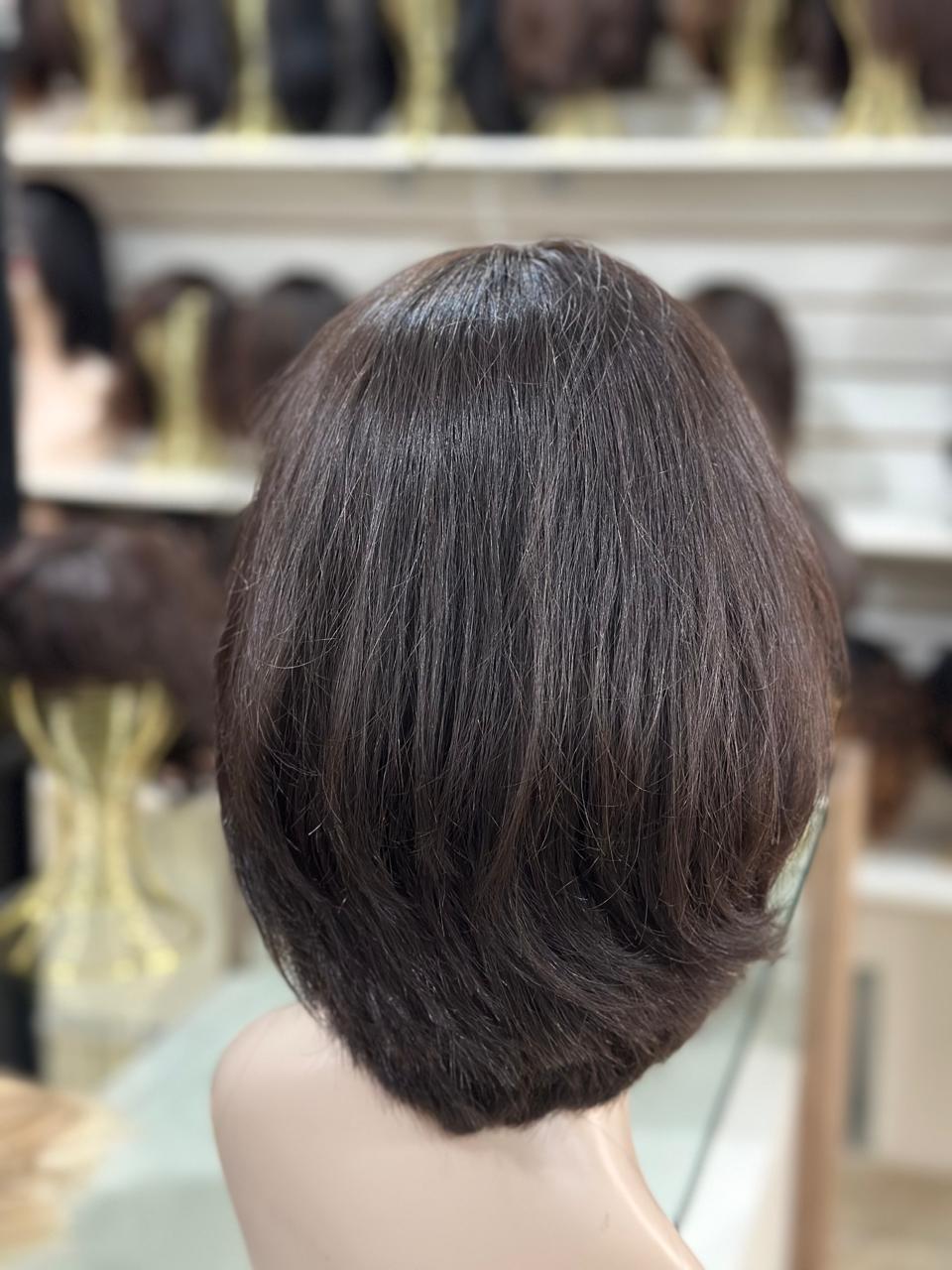 PERUCA WIG CURTA DE CABELO BRASILEIRO HUMANO , COM FRANJA , CASTANHO ESCURO DE 30 CM ( TOUCA COM REGULAGEM NO TAMANHO)